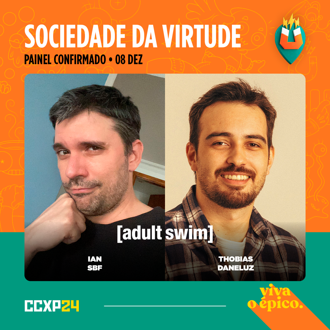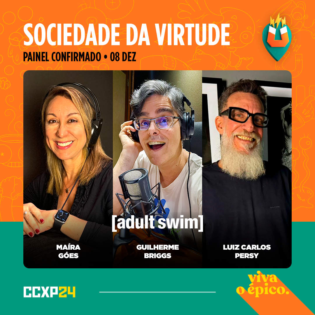 São Paulo, 18 de novembro de 2024 – Pelo segundo ano consecutivo, a Max volta à CCXP com o [adult swim]! Nesta edição, a marca terá os criadores de SOCIEDADE DA VIRTUDE, Ian SBF e Tobias Daneluz, ao lado dos atores de voz original Guilherme Briggs, Maíra de Farias e Luiz Carlos Pereira da Silva (Persy) para anunciar com exclusividade novidades da produção. Os fãs dos super-heróis já podem se preparar!