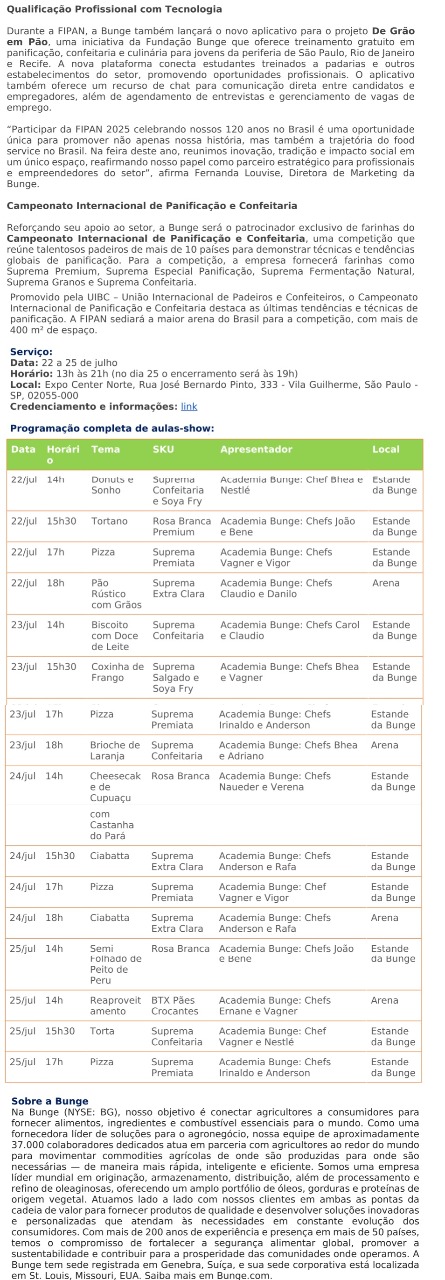 Com estande interativo e aulas-show exclusivas, Bunge celebra 120 anos no Brasil durante a FIPAN 2025