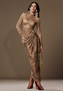 Vestindo Valentino, Sabrina surgiu com um vestido longo de renda em tom dourado envelhecido, com transparência e drapeados que desenhavam a silhueta de forma escultural. O modelo de mangas longas e gola alta combinava delicadeza e dramaticidade, com textura floral. Os maxi brincos ornamentais, a clutch estruturada e o salto em tom terroso completaram a produção.