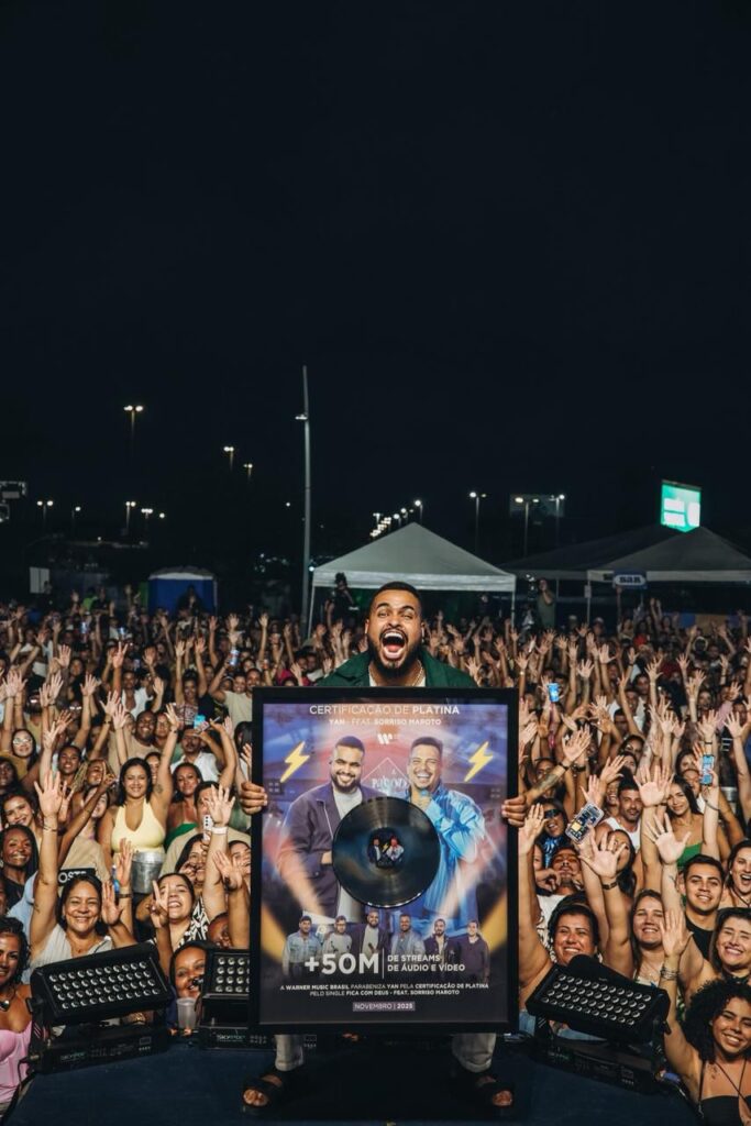 A noite também reservou um momento especial de reconhecimento: Yan recebeu da Warner Music Brasil a placa comemorativa pelos 50 milhões de streams de “Fica com Deus”, seu feat com o Sorriso Maroto, um dos maiores sucessos do pagode em 2025. Além de comemorar com a gravadora e com sua família, Yan fez questão de reunir sua equipe e sua banda no palco para agradecer publicamente, reforçando que essa conquista é coletiva e resultado do trabalho de todos.